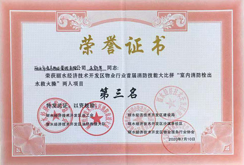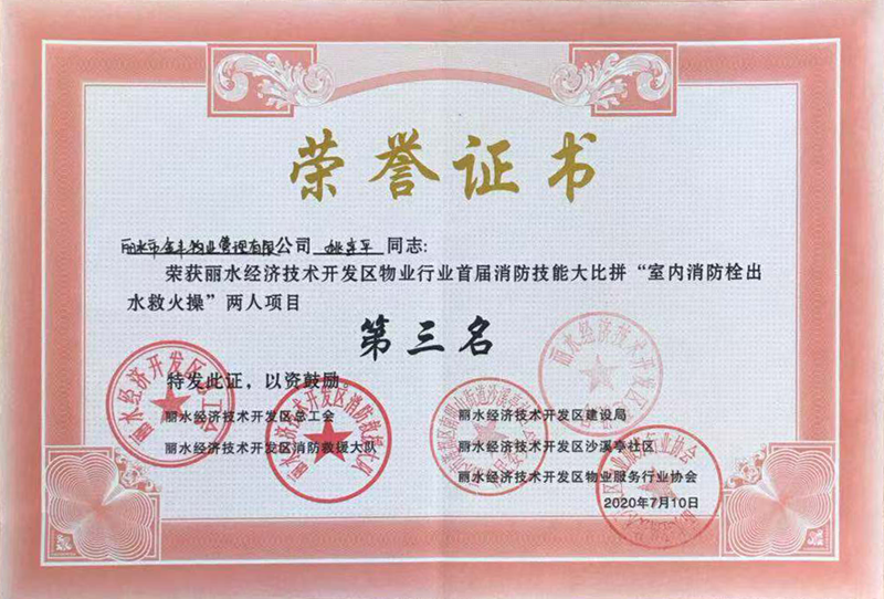 首屆消防技能大比拼“室內(nèi)消防栓出水救火操”第三名 2020-07-23 17:46:05 16 上一篇 : 首屆消防技能大比拼團體總分第三名 下一篇 : 首屆消防技能大比拼“兩人兩盤水帶連接”第三名